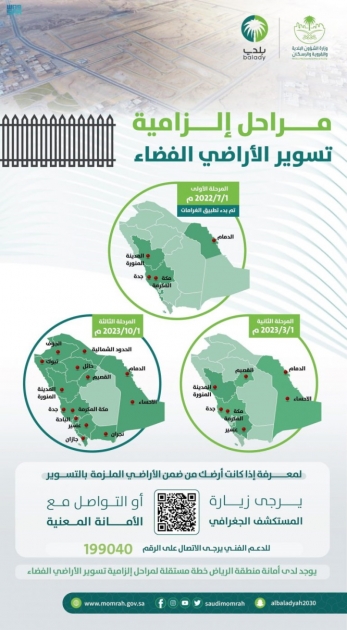 وتشمل المرحلة الثانية مناطق (عسير، والقصيم، والأحساء)، كما تمت إضافة محاور جديدة أخرى في كل من (مكة المكرمة، والمدينة المنورة، وحاضرة الدمام والخبر، ومحافظة جدة)، وتضم المرحلة الثالثة مناطق (تبوك، وحائل، والحدود الشمالية، والجوف، ونجران، والباحة، وجازان، ومحافظتي حفر الباطن والطائف)، فيما بدأت أمانة منطقة الرياض أول أكتوبر الجاري إلزام ملاك الأراضي الواقعة ضمن المناطق المستهدفة بمدينة الرياض بتسوير أراضيهم.