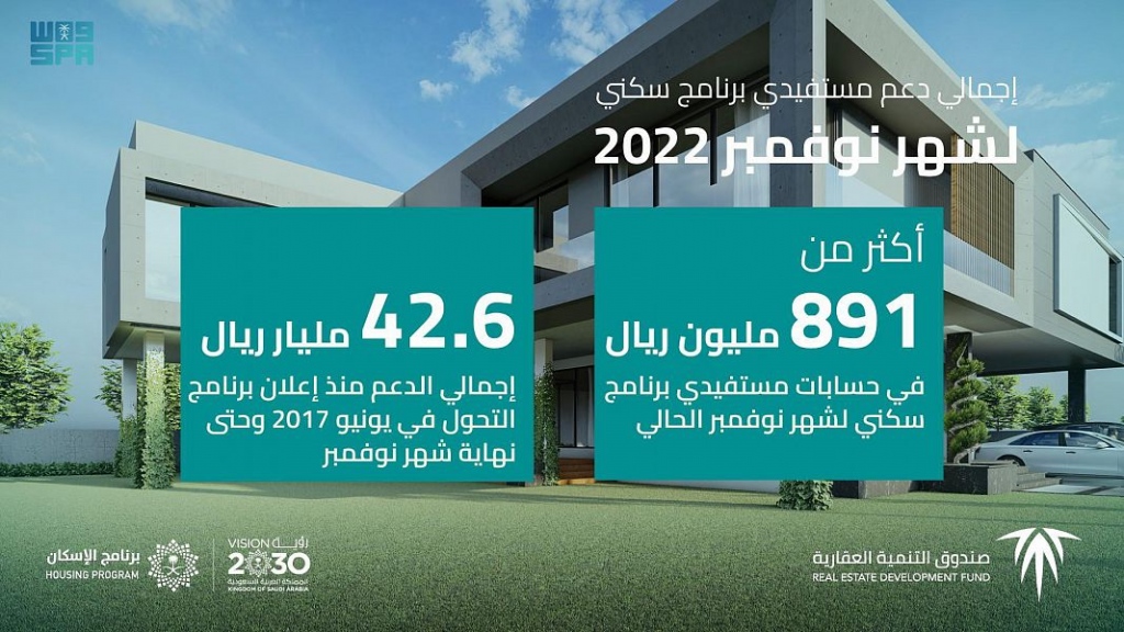 وأوضح الرئيس التنفيذي للصندوق العقاري منصور بن ماضي أن إجمالي دعم نوفمبر البالغ 891 مليون ريال، خُصص دعمًا لأرباح عقود التمويل العقاري المدعوم، مبينًا أن إجمالي ما تم إيداعه في حسابات مستفيدي سكني منذ إعلان برنامج التحّول في يونيو 2017 حتى شهر نوفمبر 2022م بلغ نحو 42.6 مليار ريال.