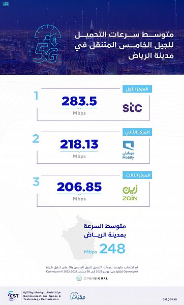 ويكشف التقرير عن متوسط سرعات التحميل، وتغطية الجيل الخامس في مدينة الرياض، حيث أظهر بلوغ متوسط سرعة التحميل للإنترنت في مدينة الرياض 248 ميجابت في الثانية، كما كشف عن وصول نسبة إجمالي التغطية فيها إلى 93.6%.