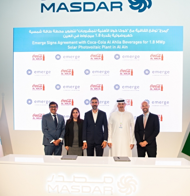 أعلنت "ايميرج"، الشركة المشتركة بين شركة أبوظبي لطاقة المستقبل "مصدر" و"اي دي اف" الفرنسية، عن توقيع اتفاقية مع "كوكا كولا الأهلية للمشروبات"، شركة تعبئة وتوزيع مشروب كوكا كولا في دولة الإمارات، لتطوير محطة طاقة شمسية كهروضوئية بقدرة 1.8 ميجاواط ضمن منشأتها للتعبئة في مدينة العين.