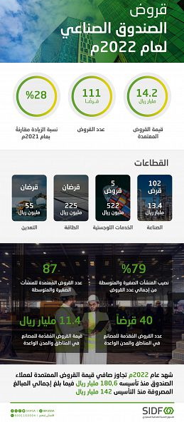 وشهد العام 2022م إقراض الصندوق لمشاريع نوعية وإستراتيجية، من شأنها أن تسهم في زيادة المحتوى المحلي وأن ترفع من جودة الصناعات المحلية، كما شهد العام ذاته تجاوز صافي قيمة القروض المعتمدة لعملاء الصندوق منذ تأسيسه 180,6 مليار ريال، فيما بلغ إجمالي المبالغ المصروفة منذ التأسيس 142 مليار ريال.