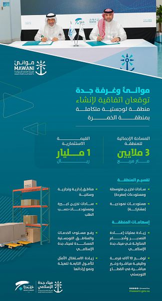 وقعت الهيئة العامة للموانئ "موانئ" و"غرفة جدة" اليوم اتفاقية لإنشاء منطقة لوجستية متكاملة بمنطقة الخُمرة جنوب جدة بقيمة استثمارية تناهز مليار ريال؛ بما يسهم في دعم التنمية الاقتصادية ومضاعفة الاستثمارات الوطنية والشراكة مع القطاع الخاص.