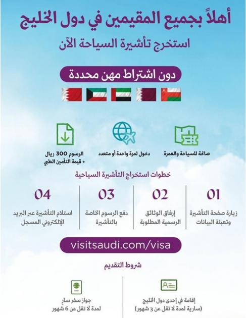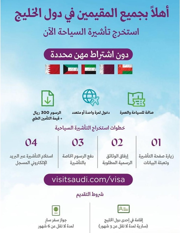 رحبت الهيئة السعودية للسياحة بالقرار؛ الذي صدر اليوم متضمناً إتاحة تأشيرة الزيارة للمقيمين بدول مجلس التعاون الخليجي، دون اشتراط مهن محددة؛ وذلك في إطار تقديم المزيد من التسهيلات، واستهداف شرائح أكبر لأداء العمرة، والاستمتاع بالوجهات السياحية، والفعاليات النوعية والعالمية حول المملكة؛ طوال العام.
