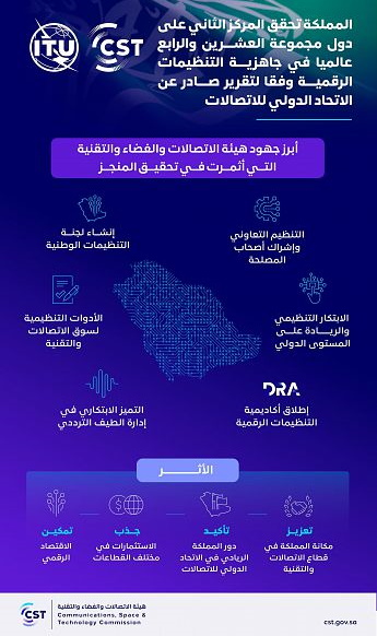 أعلن الاتحاد الدولي للاتصالات (ITU) عن تحقيق المملكة المركز الثاني على دول مجموعة العشرين، والمركز الرابع عالميا في جاهزية التنظيمات الرقمية، عقب نجاحها في بناء إطار تنظيمي مستدام والتحول نحو التنظيم التعاوني الرقمي لتمكين الاقتصاد الرقمي.