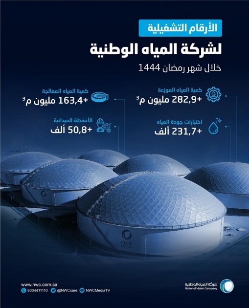 أعلنت شركة المياه الوطنية نجاح خطتها التشغيلية والفنية لتوفير إمدادات المياه وإدارتها لموسم رمضان للعام الجاري، حيث وزعت أكثر من (282) مليون متر مكعب من مطلع 1 إلى 29 رمضان 1444هـ في جميع مناطق المملكة.