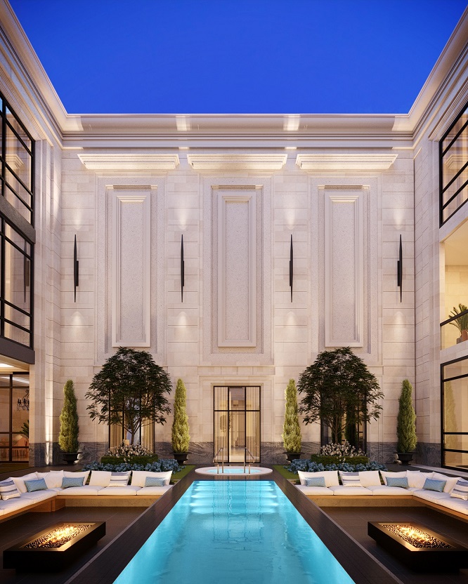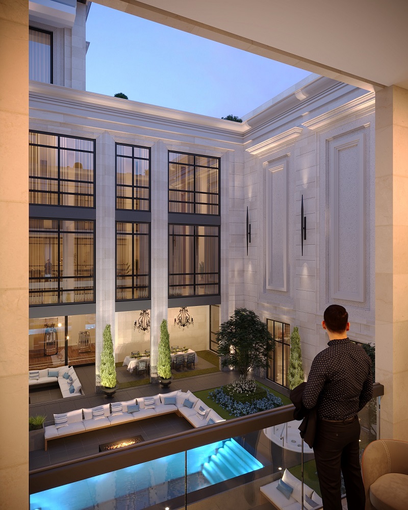 ويتميز المشروع عن غيره بأن المبنى يواجه الشارع، في حين تمتد الساحة ضمن الحدود الداخلية للمبنى. ويجمع هذا المفهوم التصميمي بين الطراز التقليدي والمعاصر ليضفي لمسة من الحداثة على العناصر التقليدية. كما يمزج بين التصميم الداخلي والخارجي ليحقق أعلى مستويات التناغم، ويشجع المالكين على الاستفادة من المساحات الخارجية إلى أقصى حد.