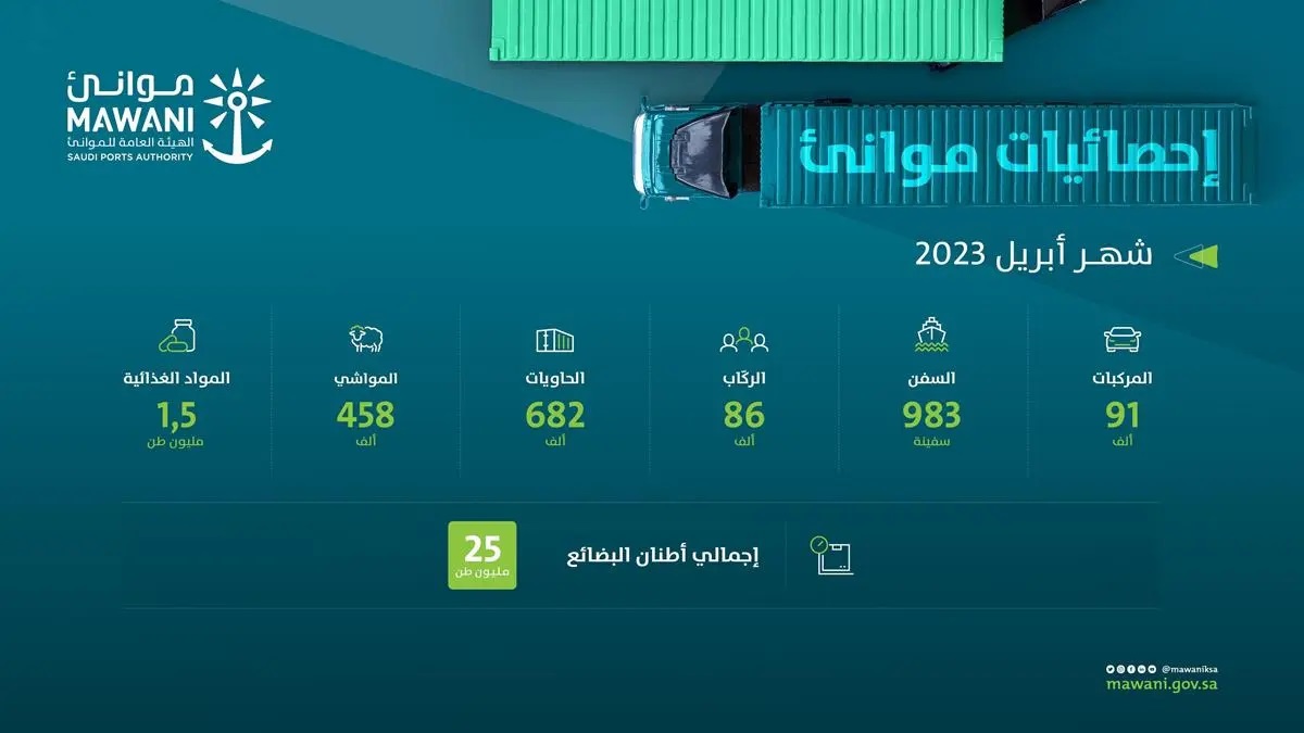 وسجلت الموانئ السعودية خلال شهر أبريل لعام 2023 انخفاضاً نسبته 6.63% في إجمالي الطنيات المناولة حيث بلغت 24,965,999 طناً من البضائع مقارنة بـ26,737,416 طناً في الفترة المقابلة من عام 2022، حيث بلغت أحجام البضائع العامة 543,496 طناً، والبضائع السائلة الصلبة 4,135,552 طناً، والبضائع السائلة السائبة 13,026,227 طناً.