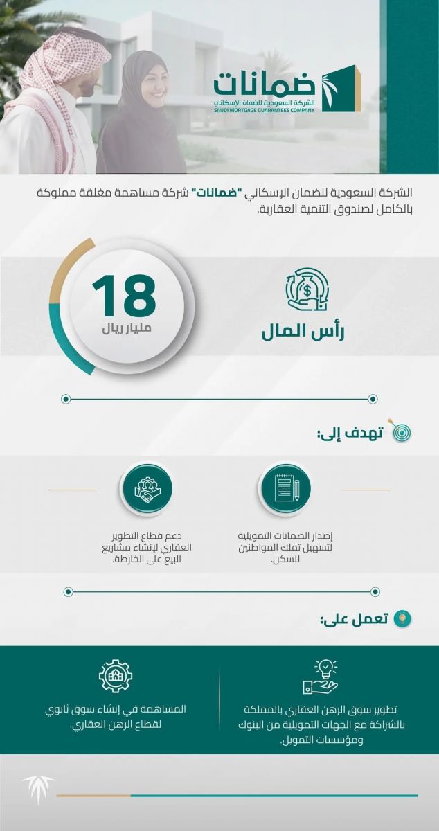 وأوضح رئيس مجلس إدارة "ضمانات"، الرئيس التنفيذي لصندوق التنمية العقارية منصور بن ماضي، أن تأسيس الشركة السعودية للضمان الإسكاني يهدف إلى إصدار الضمانات التمويلية لتسهيل تملك المواطنين للسكن، ودعم قطاع التطوير العقاري لإنشاء مشاريع البيع على الخارطة، لافتًا إلى أن البيئة التنظيمية والتشريعية لقطاع التمويل العقاري بالمملكة أسهمت في نجاح البرامج والمبادرات، التي كان لها الأثر الكبير في تأسيس شركة "ضمانات" التي تُعد استكمالًا وتتويجًا لنجاح برنامج ضمانات التمويل العقاري، الذي انطلق في 2018 ومكّن أكثر من 113 ألف مستفيد من تملك السكن حتى نهاية الربع الأول من 2023.