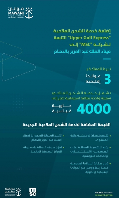 أعلنت الهيئة العامة للموانئ "موانئ" اليوم، عن إضافة شركة البحر الأبيض المتوسط للملاحة "MSC" خدمة الشحن الملاحية الجديدة "Upper Gulf Express" إلى ميناء الملك عبدالعزيز بالدمام؛ بهدف خدمة الحركة التجارية، وتعزيز موقع المملكة على خريطة المراكز اللوجستية العالمية.