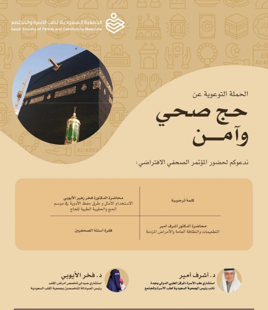 عقدت الجمعية السعودية لطب الأسرة والمجتمع مؤتمرا صحفيا افتراضيا بالتعاون مع شركة فایزر السعودية والذي يهدف إلى توعية الحجاج بأخذ الاحتياطات اللازمة للوصول إلى حج صحي وآمن. وقد عقد المؤتمر الصحفي تحت شعار نحو حج صحي وآمن والذي حضره نخبة من الصحفیین والإعلامیین من مختلف الوسائل الاعلامية السعودية