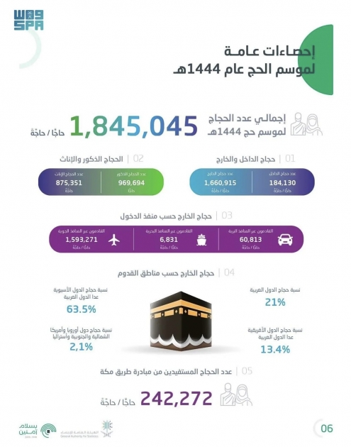 الهيئة العامة للإحصاء : إجمالي أعداد الحجاج لموسم حج 1444هـ بلغ (1,845,045) حاجًّا وحاجَّة