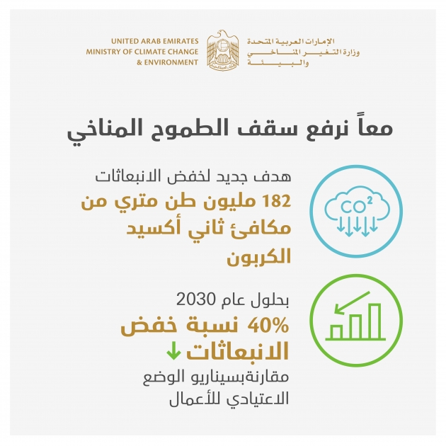 أعلنت وزارة التغير المناخي والبيئة اليوم عن خارطة طريق شاملة لخفض الانبعاثات الكربونية بنسبة 40% بحلول عام 2030 مقارنة مع سيناريو الوضع الاعتيادي للأعمال. ويأتي ذلك بعد اعتماد مجلس الوزراء النسخة الثالثة من الإصدار الثاني لتقرير المساهمات المحددة وطنياً لدولة الإمارات.