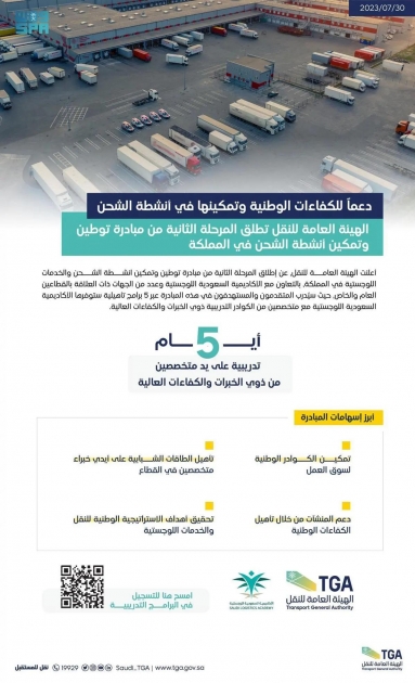 أطلقت الهيئة العامة للنقل المرحلة الثانية من مبادرة توطين وتمكين أنشطة الشحن والخدمات اللوجستية في المملكة، بالتعاون مع الأكاديمية السعودية اللوجستية وعدد من الجهات ذات العلاقة بالقطاعين العام والخاص.