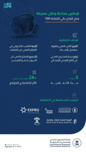 وقّعت هيئة المحتوى المحلي والمشتريات الحكومية اتفاقية لتوطين صناعة ونقل معرفة منتج قناع عالي الكفاءة 95 N، بالشراكة مع شركة نوبكو الوطنية للشراء الموحد للأدوية والأجهزة والمستلزمات الطبية، وشركة عناية، والجهات الحكومية المستفيدة.