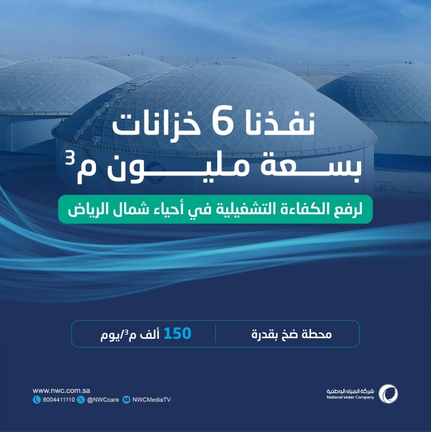 ضمن جهودها المتواصلة لتنفيذ خططها الاستراتيجية لتهيئة البنى التحتية في قطاعي المياه والخدمات البيئية، أعلنت شركة المياه الوطنية عن الانتهاء من تنفيذ وتشغيل منظومة الخزن الاستراتيجي الواقعة في محطة تنقية المياه بصلبوخ شمال مدينة الرياض، وبسعة بلغت مليون متر مكعب، وبتكلفة إجمالية تجاوزت (403) ملايين ريال.