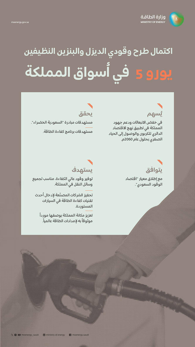 أعلنت وزارة الطاقة اليوم، عن اكتمال طرح وقودي الديزل والبنزين النظيفين (يورو 5) في أسواق المملكة، ليحلا محل وقودي الديزل والبنزين اللذين كانا في الأسواق.
