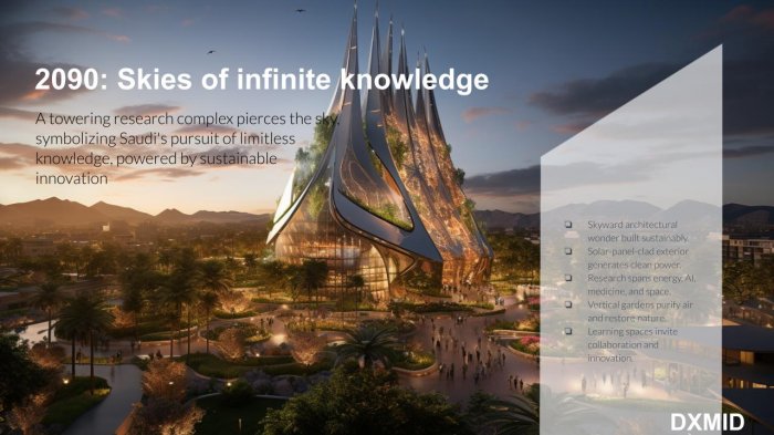 الخطة تشمل بناء مجمّع بحثي ضخم يرمز إلى طموح المملكة العربية السعودية للتموضع كمركز عالمي للمعرفة والابتكار. هذا المجمّع لن يكون تحفة معمارية وحسب إنما مركزا للتبادل المعرفي والبحث العلمي والهادف لجذب المواهب العالمية.