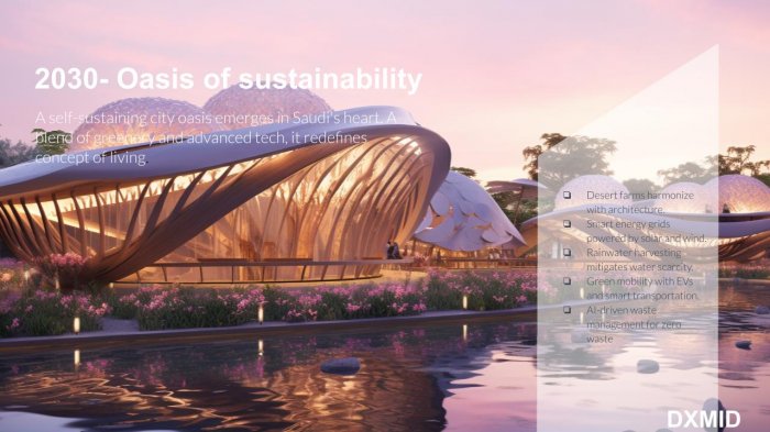 بحلول العام 2030 تصوّر الخطّة تحويل المملكة العربية السعودية إلى واحة خضراء حيث تتشابك التكنولوجيا بالطبيعة ويتظافران في سبيل وضع معايير سبّاقة في العيش المستدام.