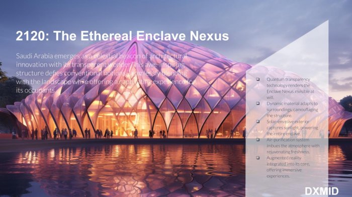 يشكّل العام 2120 أوجّ الخطّة مع مشروع معماري رؤيوي هو مركز الجيب الأثيري أو Ethereal Enclave Nexus الذي يعيد تعريف العلاقة بين المساحات المبنيّة والبيئة عبر تقنيات طاقة نقطة الصفر غير المحدودة وميكانيكا الكم في سبيل توفير حلول لتخطي مشاكل على مستويات مستحيلة وغير مسبوقة.