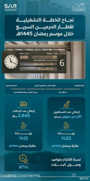 أعلنت شركة الخطوط الحديدية السعودية "سار" نجاح الخطة التشغيلية لموسم رمضان لهذا العام 1445 هـ، مشيرة إلى تحقيق أرقام غير مسبوقة بنقل أكثر من مليون مسافر بزيادة قدرها 22% مقارنة برمضان 1444ه‍، وكان ذلك من خلال 2,845 رحلة بارتفاع 12% عن ذات الفترة من العام الماضي عبر قطار الحرمين السريع، الذي يربط مكة المكرمة بالمدينة المنورة، وذلك في إطار خدمة ضيوف الرحمن وتسهيل أدائهم لمناسكهم بكل يسر وسهولة.