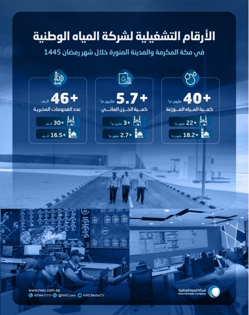 أعلنت شركة المياه الوطنية نجاح خطتها التشغيلية والفنية لتوفير إمدادات المياه وإدارتها لموسم رمضان للعام 1445هـ في مكة المكرمة والمدينة المنورة، حيث وزعت أكثر من (40.2) مليون متر مكعب، منها 22 مليون متر مكعب في مكة المكرمة، ويقابلها(18.2) مليون متر مكعب في المدينة المنورة .