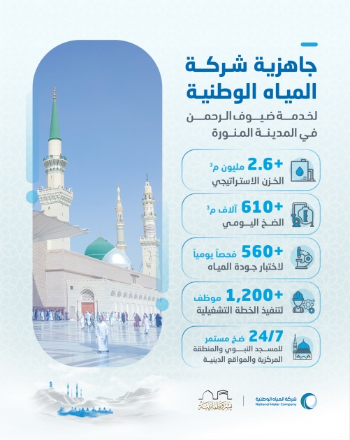 وأكدت الشركة جاهزية أكثر من (1200) موظف من أطقمها الفنية والهندسية والإدارية لمتابعة العمليات التشغيلية التي تضمنت توزيع أكثر من (610) آلاف م3 من المياه يومياً، بمعدل ضخ مستمر 24/7 في المسجد النبوي والمنطقة المركزية والمزارات الدينية.