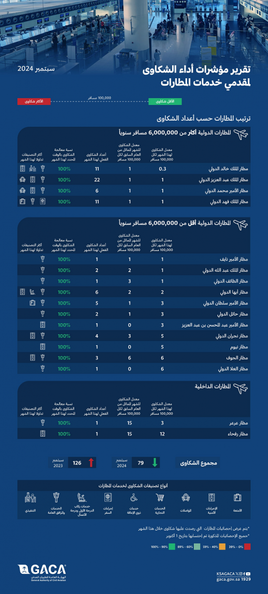 أصدرت الهيئة العامة للطيران المدني - اليوم - مؤشر تصنيف مقدمي خدمات النقل الجوي والمطارات، من واقع عدد الشكاوى المرفوعة من المسافرين للهيئة خلال شهر سبتمبر 2024.