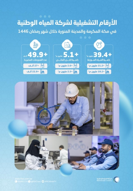 أعلنت شركة المياه الوطنية نجاح خطتها التشغيلية والفنية لتوفير المياه وإدارتها لموسم رمضان للعام 1446هـ بالحرمين الشريفين في مكة المكرمة والمدينة المنورة، حيث وزعت أكثر من (39.4) مليون متر مكعب، منها (21.2) مليون متر مكعب في مكة المكرمة، ويقابلها (18.2) مليون متر مكعب في المدينة المنورة، بمتابعة ومراقبة ذكية تضمن تقديم أرقى الخدمات للمعتمرين والزوار والسكان.