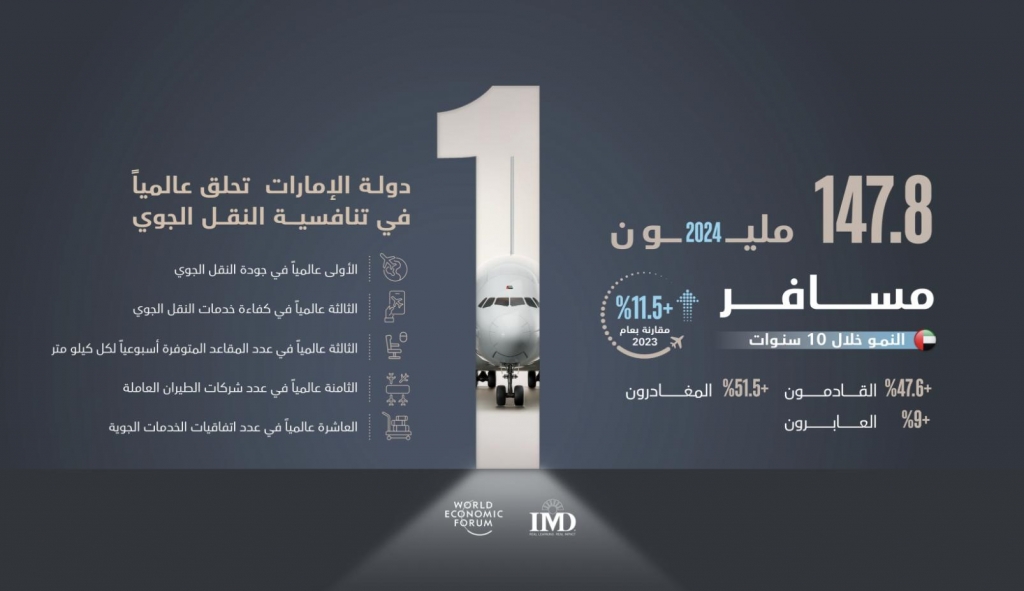 وأظهرت بيانات التقرير الصادر عن المركز الاتحادي للتنافسية والإحصاء حلول الدولة في المرتبة الأولى عالمياً في مؤشر جودة النقل الجوي، وضمن المراتب العشر الأولى عالمياً في خمس مؤشرات، ما يجسد الرؤية الاستشرافية للقيادة الرشيدة وتوجيهاتها السديدة، بتعزيز نمو هذا القطاع الحيوي ودعم تنافسيته على المستوى الإقليمي والعالمي، باعتباره مرتكزاً أساسياً لدعم نمو واستدامة الاقتصاد الوطني.