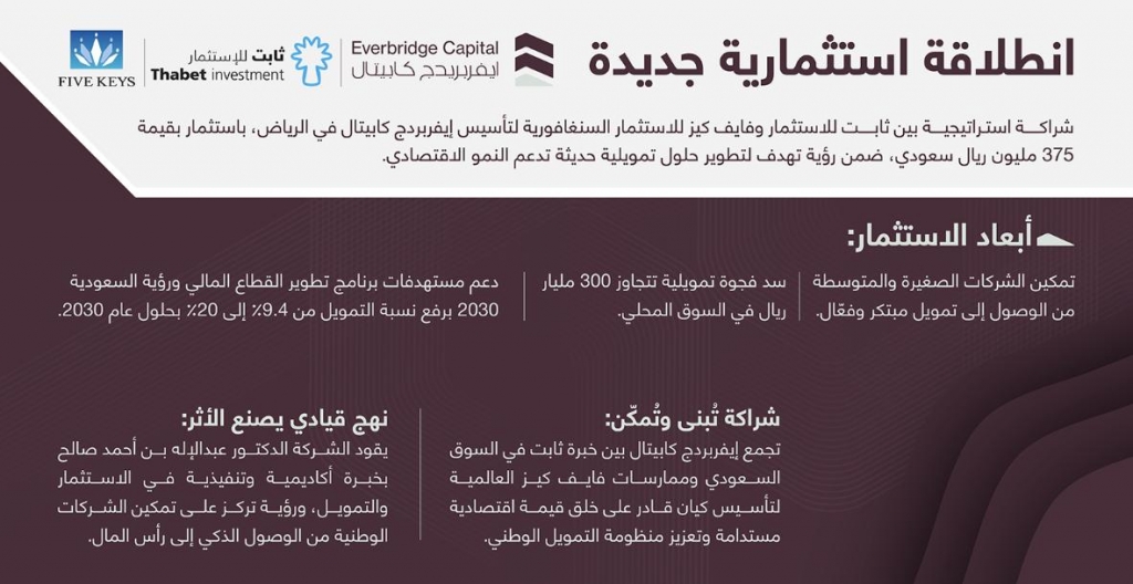 ثابت للاستثمار وفايف كيز السنغافورية تطلقان إيفربردج كابيتال باستثمار 375 مليون ريال
