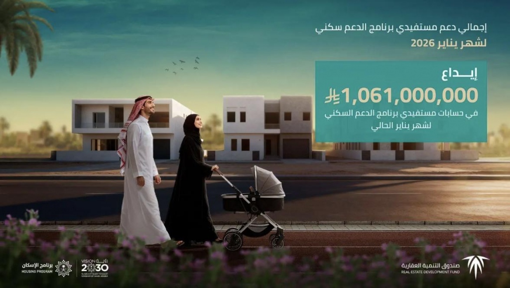 أعلن صندوق التنمية العقارية اليوم، عن إيداع مليارٍ وواحد وستين مليون ريال في حسابات مستفيدي برنامج الدعم السكني من وزارة البلديات والإسكان، والصندوق العقاري، عن شهر يناير 2026م.