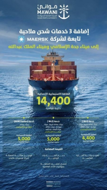أعلنت الهيئة العامة للموانئ "موانئ", إضافة 3 خدمات شحن ملاحية جديدة تابعة لشركة "Maersk" العالمية، إلى ميناء جدة الإسلامي وميناء الملك عبدالله؛ مما يعزز مكانة موانئ المملكة كمحور رئيسي للتجارة البحرية، ويدعم تنافسيتها على مستوى المنطقة والعالم.