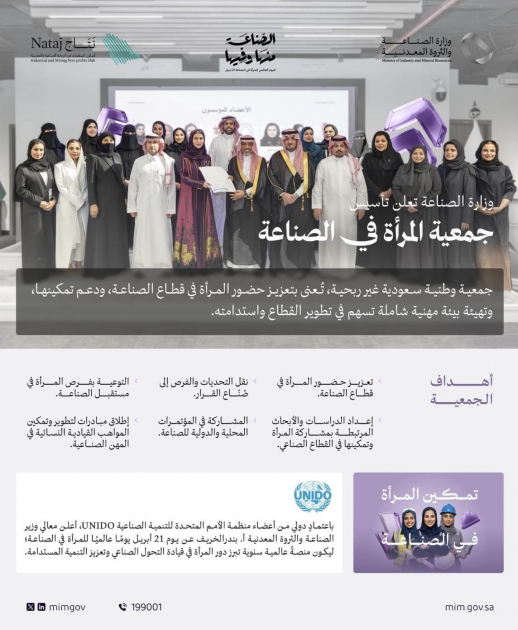 يذكر أن تأسيس جمعية المرأة في الصناعة غير الربحية، يأتي ضمن جهود وزارة الصناعة والثروة المعدنية؛ لتمكين القطاع غير الربحي، وتعزيز دوره في مجالات الصناعة والتعدين، وزيادة إسهامه وأثره المباشر في إجمالي الناتج المحلي للاقتصاد الوطني، وفقًا لمستهدفات رؤية المملكة 2030.
