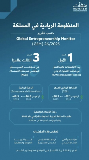 وتؤكد هذه النتائج ما تشهده المملكة من نمو متواصل في النشاط الريادي وارتفاع مستوى الثقة لدى الأفراد، إلى جانب قوة البيئة التمويلية والتنظيمية، بما يسهم في تعزيز استدامة نمو المنشآت ورفع تنافسيتها.