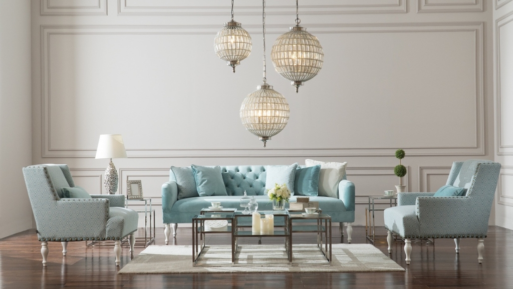 ولإضفاء مزيد من الفخامة على المجموعة، تمت إضافة ثريا ذات تصميم رائع لتعطي شعورًا مفعمًا بالدفء والراحة.