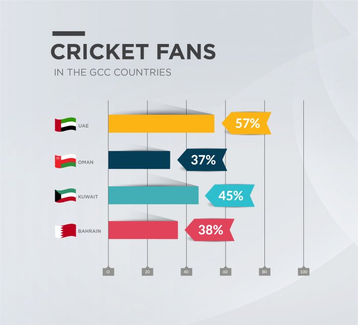 أظهر استطلاع أعدّته شركة YouGov بتكليف من الإمارات العربيّة المتحدة للصرافة تنامي شعبية رياضة الكريكيت في دول منطقة الخليج العربي بمستوى غير مسبوق لتتفوق على كرة القدم التي لطالما استأثرت باهتمام الجمهور. وفي سؤال قارن مدى شعبية الكريكيت مع رياضات شهيرة أخرى مثل كرة القدم والتنس والفورمولا 1 وكرة السلة، سجلت نسبة عشاق هذه الرياضة بين سكان دولة الإمارات 57%، وبين مواطني الدولة الذين شاركوا بالاستطلاع 69%.