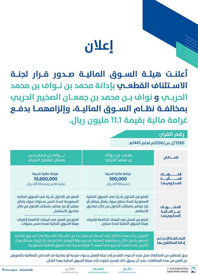 ووفقاً لهيئة السوق المالية، فإن لجنة الاستئناف أصدرت قرارها القطعي بإدانة كل من محمد بن نواف بن محمد الحربي صاحب المعرف (@mnawafms)، ونواف بن محمد بن جمعان الصخيبر الحربي صاحب المعرف (@nawafmsz) بمخالفة المادة التاسعة والأربعين من نظام السوق المالية، والمادة الثامنة من لائحة سلوكيات السوق، لقيام المدان الأول محمد بن نواف بن محمد الحربي خلال الفترة الممتدة من تاريخ05/07/2020م حتى تاريخ 07/06/2021م، وقيام المدان الثاني نواف بن محمد بن جمعان الصخيبر الحربي خلال الفترة الممتدة من تاريخ 29/12/2019م حتى تاريخ 18/12/2021م، بالترويج لرأي من خلال حساباتهما في وسيلة التواصل الاجتماعي (X) (تويتر سابقاً بالمعرفين المذكورين ، وحث الآخرين على الشراء أو البيع في أسهم الشركات التالية: بنك الجزيرة (الجزيرة)، وشركة صدر للخدمات اللوجستية (صدر)، وشركة كيميائيات الميثانول (كيمانول)، وشركة المصافي العربية السعودية (المصافي)، وشركة الجبس الأهلية (جبسكو)، وشركة وفرة للصناعة والتنمية (وفرة)، والشركة السعودية للصناعات المتطورة (المتطورة)، وشركة الصناعات الزجاجية الوطنية (زجاج)، وشركة تصنيع مواد التعبئة والتغليف (فيبكو)، والشركة السعودية لإنتاج الأنابيب الفخارية (الفخارية)، وشركة أسمنت أم القرى (أسمنت أم القرى)، وشركة ثوب الأصيل (الأصيل)، وشركة باعظيم التجارية (باعظيم)، وشركة تبوك للتنمية الزراعية (تبوك الزراعية)، وشركة الشرقية للتنمية (الشرقية للتنمية)، وشركة الجوف الزراعية (الجوف)، وشركة بحر العرب لأنظمة المعلومات (بحر العرب).