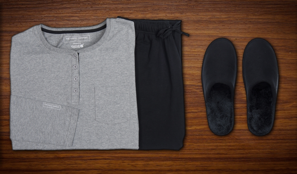 والتزاماً بتقديم خدمة راقية رائدة عالمياً، تقدم الناقلة القطرية أطقم نوم حصرية لركاب الدرجة الأولى مع اعتماد تصميم خاص لكل من الرجال والنساء. صممت ملابس النوم للرجال باللون الرمادي الداكن بينما تأتي ملابس السيدات بلون رمادي فاتح وعصري وهي مصنوعة بالكامل من القطن لتوفر أعلى مستويات الراحة. وتأتي أطقم النوم مع خفين فاخرين من القطن بطبقة من الفرو الدخلية الناعمة لتوفر المزيد من الدفء والراحة.