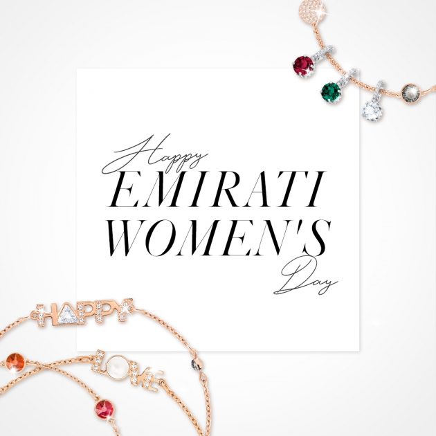 بمناسبة يوم المرأة الإماراتية، يسرّ سواروفسكي أن تهنّىء نساء الأمّة على إنجازاتهن ومساهماتهن لضمان الأداء الفعال والناجح للمجتمع الإماراتي. فاختارت لهذه المناسبة الخاصة أبجدية "ريمكس" البراقة ومجموعة "ماي فلاي" الرقيقة باعتبارها التصاميم المثالية من سواروفسكي لتخليد ذكرى يوم المرأة الإماراتية. وبذلك بات بإمكان نساء الأمّة أن يتباهين بكلّ فخر بالأحرف التي تؤلّف كلمة الإمارات تأكيداً على تفانيهن  والتزامهن تجاه البلد الغالي على قلوبهن.