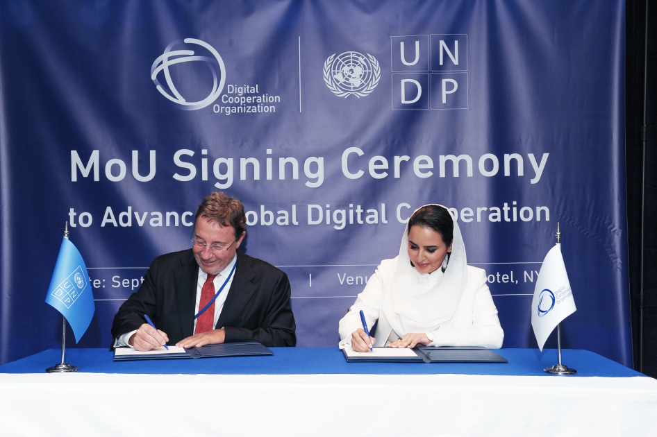 ووقع الطرفان الاتفاقية في فعالية خاصة على هامش مؤتمر القمة المعني بالمستقبل، والتي استضافها مقر الأمم المتحدة في نيويورك، حيث وقعت الأمين العام لمنظمة التعاون الرقمي الأستاذة ديمة بنت يحيى اليحيى، ومدير برنامج الأمم المتحدة الإنمائي السيد أخيم شتاينر، مذكرة تفاهم عالمية ترمي إلى توسيع نطاق التعاون في مجال النهوض بالسياسات الرقمية، وتعزيز المؤشرات والبحوث الرقمية، وتحسين القدرات والمهارات الرقمية، وتطوير الحلول الرقمية، ودعم مشاركة المرأة الفعالة في تكنولوجيا المعلومات والاتصالات، بالإضافة إلى تحفيز الجهود العالمية الرامية لسد الفجوة الرقمية.