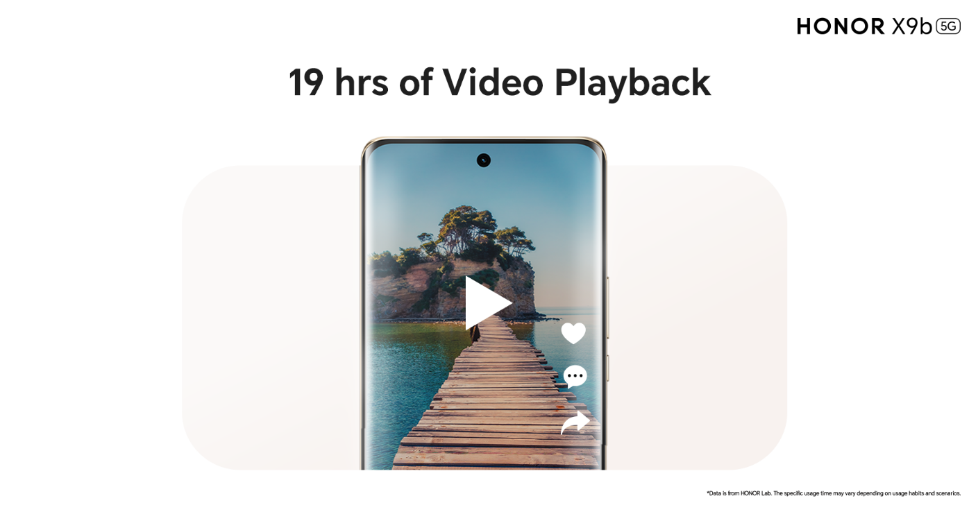 تخيلوا أنه يمكنكم الاستمتاع بمشاهدة برنامجكم المفضل دون انقطاع ولمدة تصل إلى 19 ساعة، وذلك عبر شحن بطارية هاتف HONOR X9b 5G بالكامل لمرة واحدة فقط، كما يمكن الاستمتاع بأكثر من 22 ساعة تصفح لمواقع التواصل الاجتماعي بالشحنة الواحدة.