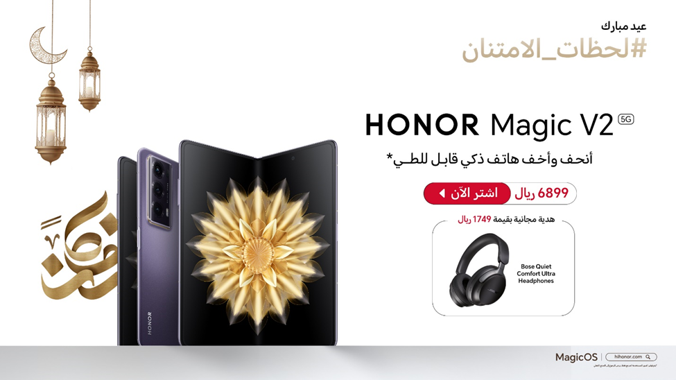 يأتي هاتف HONOR Magic V2 بسعر خاص مقابل 6899 ريال سعودي مع سماعات Bose Quiet Comfort Ultra مجاناً خلال عروض العيد.
