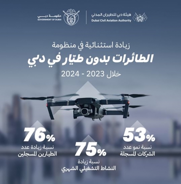 سجلت هيئة دبي للطيران المدني نموا استثنائيا في منظومة الطائرات بدون طيار في دبي خلال الفترة 2023-2024، بزيادة ملحوظة في عدد الطيارين المسجلين بنسبة 76%، فيما شهد القطاع نموّاً في عدد الشركات المسجلة بنسبة 53%، إلى جانب النموّ بنسبة 75% في النشاط التشغيلي الشهري.