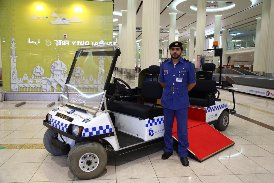 بعدما ابتكر السيارة الذكية «الكاشف»، الأولى من نوعها على مستوى الدولة والعالم التي تخدم التفتيش الجمركي في المطارات، وتختصر الوقت والجهد لجميع العملاء، يطلق محمد أحمد سعيد الخنجري قائد فريق بإدارة عمليات المسافرين في جمارك دبي، ابتكاره الجديد وهو عبارة عن عربة التخليص الجمركي الذكية لخدمة ذوي الإعاقة وكبار السن وكبار الشخصيات على حدٍ سواء، إذ طوّر سيارة «غولف» صغيرة تعمل على الكهرباء بكاميرا أمنية وأخرى لبصمة الوجه، وكرسي إلكتروني متحرك لموظف التفتيش وأخرى للعميل، وثلاث شاشات تخدم موظف التخليص والعميل وذوي الإعاقة، وممر كهربائي للصعود إلى المركبة، وطاولة لفحص البضاعة، وصندوق للحفظ وآخر للإسعافات الأولية، بالإضافة إلى طابعة.