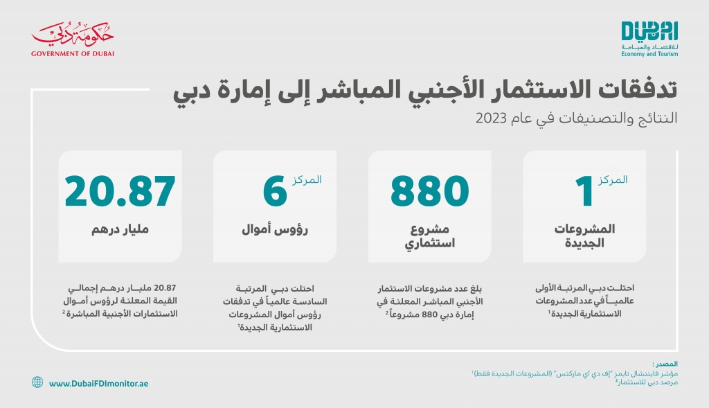 وسجلت دبي ارتفاعاً سنوياً في استقطاب رؤوس أموال الاستثمار الأجنبي المباشر العالمية، والتي وصلت إلى 20.87 مليار درهم (5.68 مليار دولار أمريكي)، مما ساهم في ارتقاء الإمارة من المرتبة الثامنة عالمياً في النصف الأول من عام 2022 إلى المرتبة السادسة في الفترة نفسها من العام الجاري ووفقاً لبيانات "فايننشال تايمز – إف دي آي ماركتس" حول أسواق الاستثمار الأجنبي المباشر.