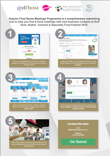 وتُتاح ميّزة البحث في دليل المشاريع والعروض للمستخدمين المسجّلين من العارضين والمشترين، كما ويحظون بفرصة حصرية للاستفادة من برنامج اجتماعات سلسلة معارض المأكولات لموسم الخريف.