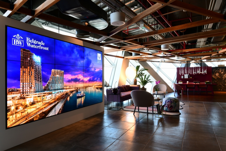ويحمل مركز المبيعات سمة تفاعلية مميزة بفضل وجود شاشة كبيرة تعمل باللمس، ويمكنها خدمة أكثر من عميل في آن واحد. وبالإضافة إلى توفير المعلومات المفيدة عن عروض المنتجات وأحدث التطورات في المشاريع، يوجد في الشاشة ذاتها قسم للترفيه، حيث يمكن للأطفال اللعب في الوقت الذي يبحث فيه آباؤهم عن منازل أحلامهم.
