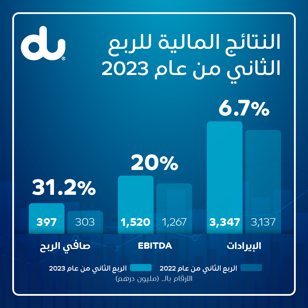أعلنت شركة الإمارات للاتصالات المتكاملة ش.م.ع ("EITC") عن نتائجها المالية للربع الثاني من العام الحالي والمنتهي بتاريخ 30 يونيو 2023، مسجلة نمواً في إيرادات الخدمات بنسبة 8.9% لتصل إيراداتها الاجمالية الربعية إلى 3.35 مليار درهم، كما شهدت "دو" زيادة في الأرباح قبل اقتطاع الفوائد والضرائب والإهلاك والاستهلاك بنسبة 20% لتصل إلى 1.52 مليار درهم، وترجع هذه النتائج الممتازة إلى زيادة الطلب المستمر على خدمات الهاتف الثابت والمتحرك. وقد حققت الشركة نمواً في صافي أرباحها بنسبة 31.2% لتصل إلى 397 مليون درهم إماراتي، بينما نما التدفق النقدي الحر من العمليات التشغيلية بنسبة 43.3% ليصل إلى 1 مليار درهم إماراتي.