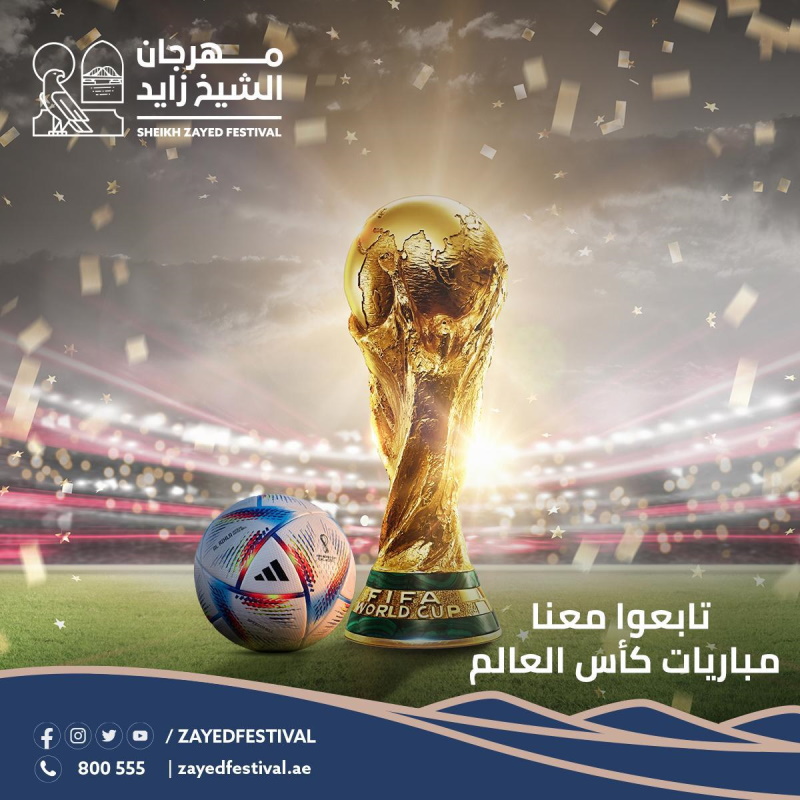 أعلنت اللجنة العليا المنظمة لمهرجان الشيخ زايد أنه تزامناً مع فعاليات "كأس العالم 2022" -الحدث الرياضي العالمي الذي ينتظره الجميع من كافة أنحاء العالم- سيوفر مهرجان الشيخ زايد العديد من الشاشات المخصصة لعرض المباريات بشكل منتظم بحيث تتوزع الشاشات في كافة أرجاء المهرجان.