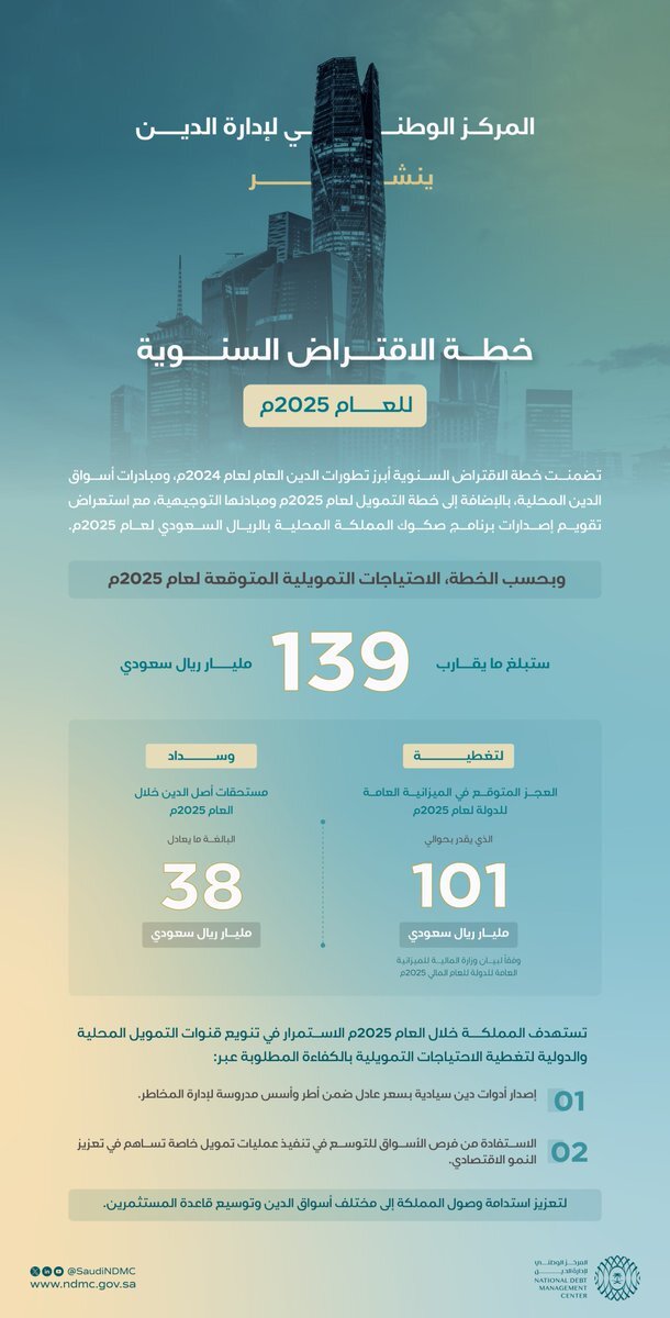 وبحسب الخطة، فإن الاحتياجات التمويلية المتوقعة لعام 2025م ستبلغ ما يقارب 139 مليار ريال ؛ لتغطية العجز المتوقع في الميزانية العامة للدولة لعام 2025م، الذي يقدر بحوالي 101 مليار ريال ، وفقاً لبيان وزارة المالية للميزانية العامة للدولة للعام المالي 2025م، وسداد مستحقات أصل الدين خلال العام الحالي 2025م البالغة ما يعادل 38 مليار ريال.